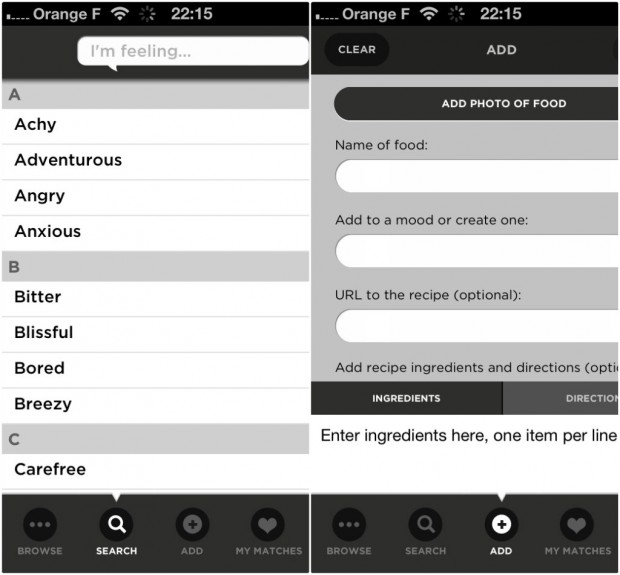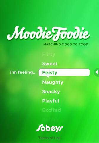 There's a "Mood Match" feature that allows you to save a favourite mood and food pairing and you can even check out how other Moodie Foodies are feeling when you open the app - the top moods of the moment are featured. You can let friends know how you’re feeling and what you’re craving on Facebook and Twitter and you can even contribute to the app yourself by adding new mood and food pairings.