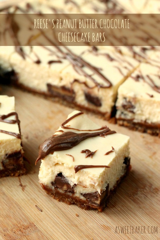 Squares and bars are perfect for popping into boxes as edible gifts. Elizabeth from A Sweet Baker shared her delicious Reeses Peanut Butter Chocolate Cheesecake Bars. Perfect for a gift box!