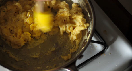 “Once I’ve cracked and seasoned my egg batter, I’ll scramble it....” (cut to B-Roll)