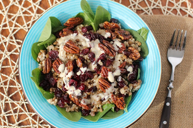 Tonight’s vegetarian meal is perfect to arrange in big bowls, get a glass of wine, and eat while cozying up on the couch after a busy week. The hearty lentils and rice are topped with cranberries and candied spiced pecans, then drizzled with a knock-your-socks-off tahini & miso dressing. It’s time to unwind and celebrate the start of the weekend.