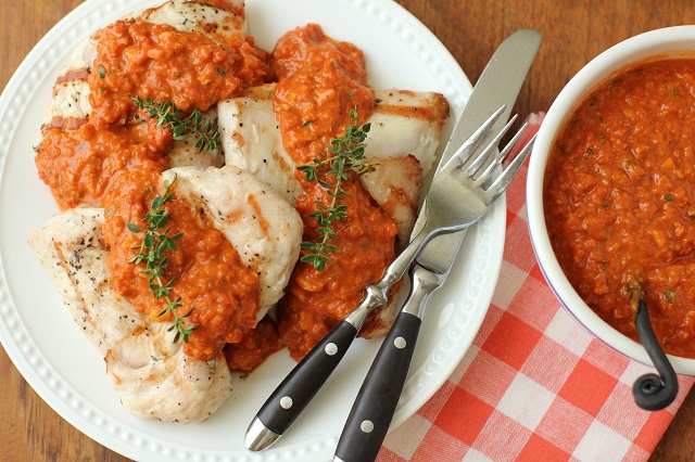 Grilled Chicken with Romesco Sauce, Juicy Grilled Mushrooms