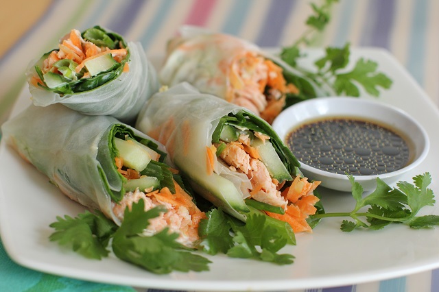 If you’ve never worked with rice paper wraps, you will be delighted with how easy it is. Turn any bits of protein or veggies into delicious hand-held wraps. Make this simple dipping sauce to add a burst of savoury flavour. Saute, grill,or bake a piece of salmon to make these rolls, or in a pinch, use good quality canned salmon (make a few with leftover chicken from Sunday’s dinner, too). Roll a few extras to pack in tomorrow’s lunch.