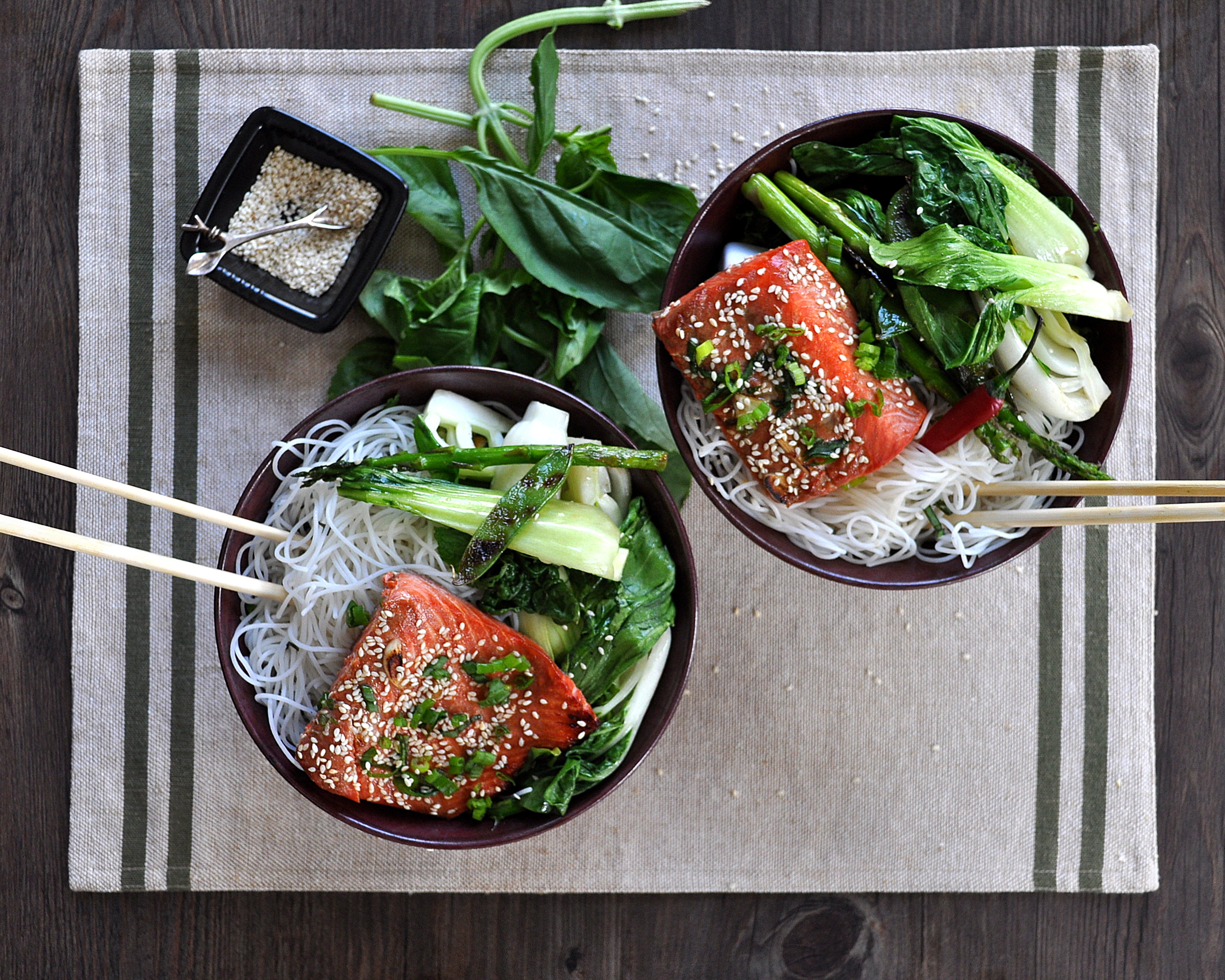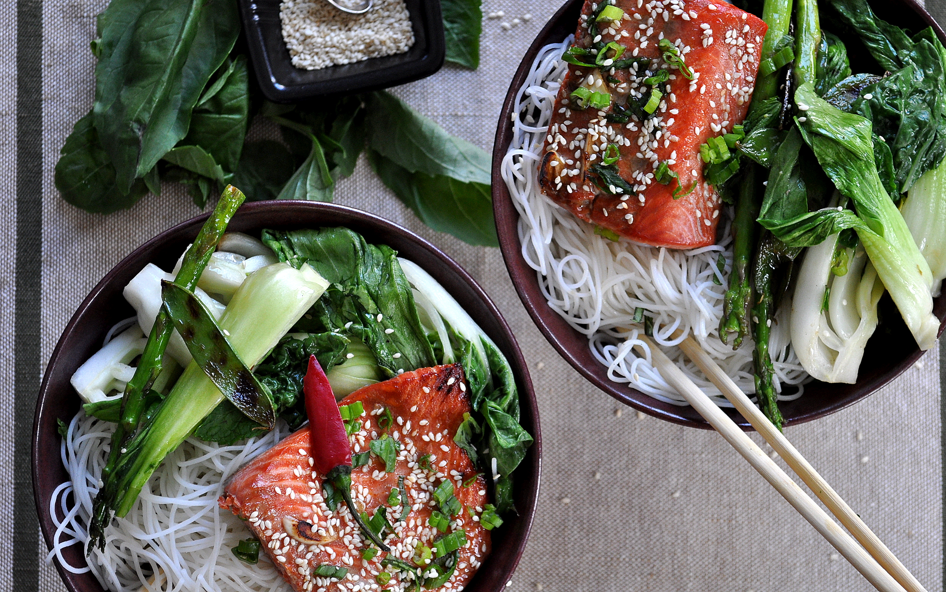 - To plate, remove the bok choy and set aside. Put noodles in a small bowl on a board and toss gently with fresh mint and basil. Spill all the green veggies around the bowl, tossing the bok choy in with the other greens. Slide the salmon pieces directly onto the board. Sprinkle a generous helping of sesame seeds, chopped scallions and leftover herbs. Add the jalapeno for heat.