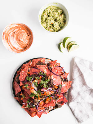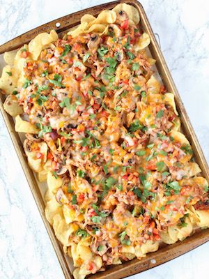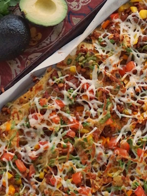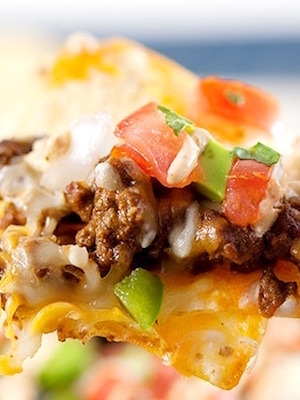 When making these [Ground Beef Nachos](http://In Search of Yummyness.), make sure to build your layers from the bottom up. Add some chips, then some toppings, then more chips, and more toppings. From **In Search of Yummyness**.