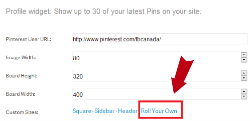 The profile widget can be customized for different sizes, and if you want people to follow a specific board, then you can also create a board widget that gets people to follow your specific board.