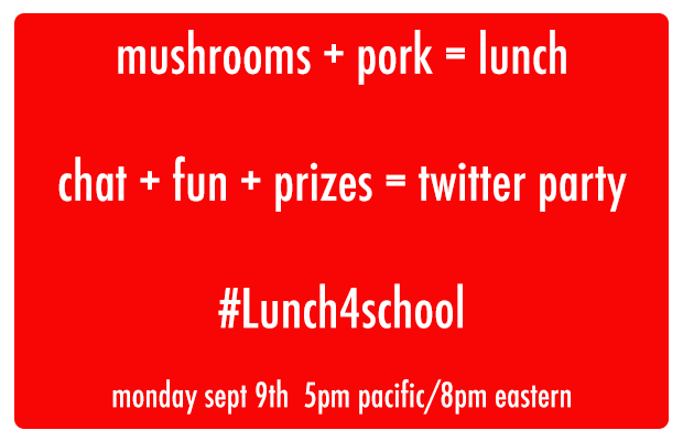 On Monday, September 9th at 8:00pm EST (5:00pm PST), Mushrooms Canada and Pork Marketing Canada are excited to host a Back to School Twitter Party and talk lunch! Registered Dietitians, Lucia Weiler and Sue Mah will be joining the party and giving tips and tricks to make back to school meals healthier without sacrificing flavour and fun!