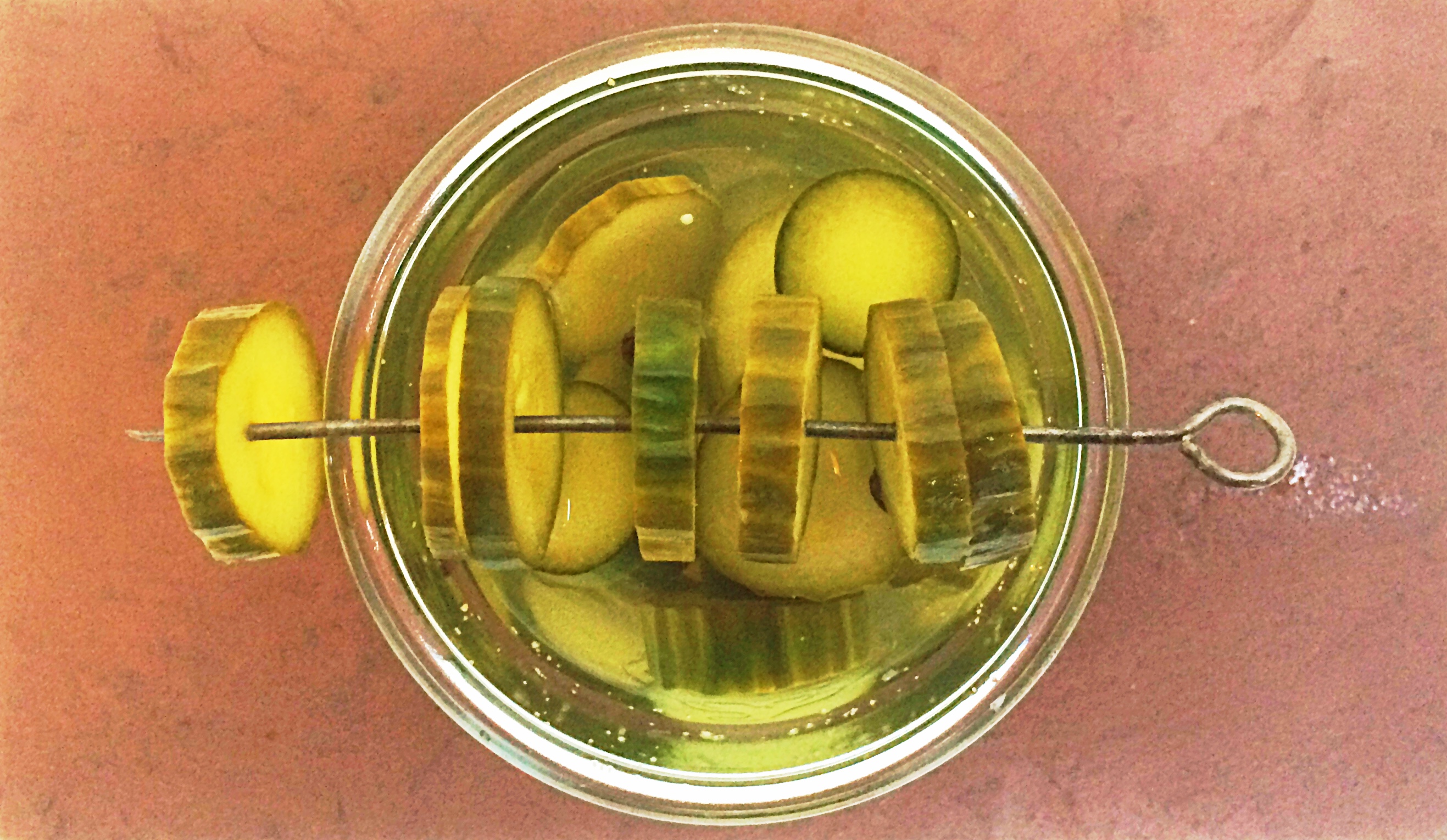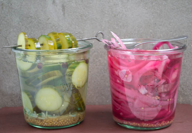 Success! It was much more painless than I thought and I even had an explanation in the book as to why my garlic turned this blue-ish/turquoise colour. Anthocyanin, a pigment that reacts to acidic solutions like a pickle brine, go figure! Within 20 minutes, the onions and the cucumber had drastically changed and I was munching away pretty impressed with myself at 12:00am. After they cooled somewhat, it became the moment of truth and with a couple of Weck Jars that I had leftover from FBC2014. The lids went on, the clips clicked on and just like that, it was done.