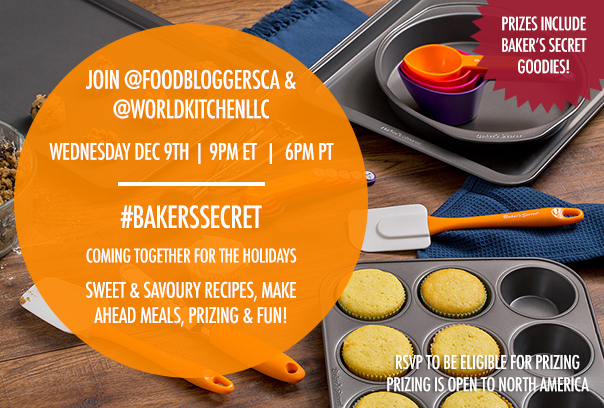 To be eligible to win a prizes you must RSVP (below) and tweet at least once (Original tweet, retweets do not count) during the party with the #BakersSecret hashtag. The winners will be announced throughout the party and be asked to contact Food Bloggers of Canada by Direct Message on Twitter and by answering a skill-testing question. Prizing is open to North America. The rules can be found here.