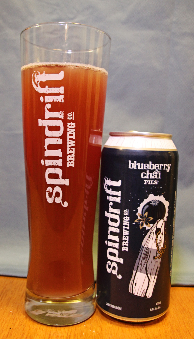 Spindrift Brewing opened the doors in 2015 to its large modern brewery in Dartmouth Nova Scotia. Their lagers can be found in liquor stores throughout Atlantic Canada. Their Blueberry Chai Pils is a new release to their lineup, hitting the shelves this month. The beer has a very interesting appearance with a copper colour and a purple hue. It's cloudy and has a very thin head. Its aroma is strong, spicy, and slightly sweet. On drinking the pils it's tart and slightly bitter. Interesting beer that's refreshing.