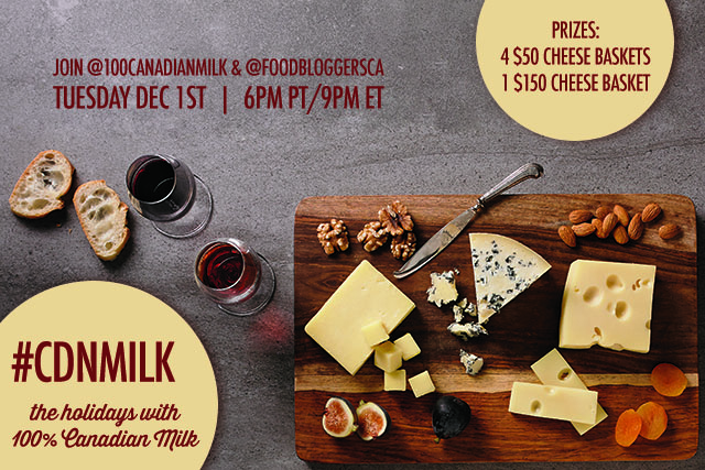 But for cheese you need milk and we're lucky in Canada to have some of the best milk around.ย That's why we're excited to co-host the #CdnMilk Twitter Party with the folks at 100%Canadian Milk. We're going to talk about the arrivalย of the 2016 Milk Calendar,ย holiday-inspired recipes with 100% Canadian Milk, cheese (becauseย it's cheese) and lots of other fun stuff! And prizes consisting of cheese baskets, see below!