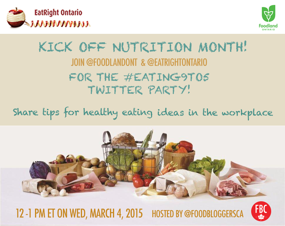 It's almost March so that means it's Nutrition Month and the theme this year is focused on eating well at work! We’re excited to be co-hosting a Twitter party with the folks over at Foodland Ontario and Eat Right Ontario for an #EATING9TO5 Twitter Party! Nutrition Month is an annual campaign organized by Dietitians of Canada. Their goal is to provide information and guidance to Canadians to eat better and integrate healthier food into their daily meals and who better than Foodland Ontario to help share with us the great Ontario products that make for a perfect lunch!