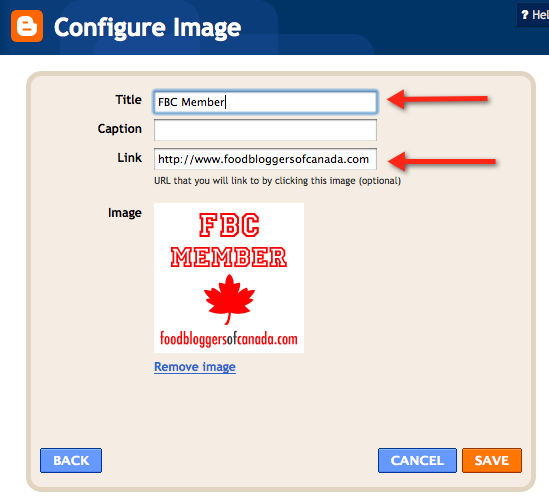 When the Add a Gadget window opens, select the Picture option and follow the instructions for uploading an image. In the link window, add the www.foodbloggersofcanada.com link. Make sure you also add a title!