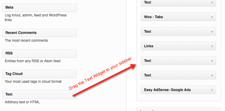WordPress has a nice drag and drop functionality for widgets so just click on the Text Widget choice and drag it over to the right, to your sidebar list. This will allow you to put in whatever type of text or HTML you like, which is exactly what we want.