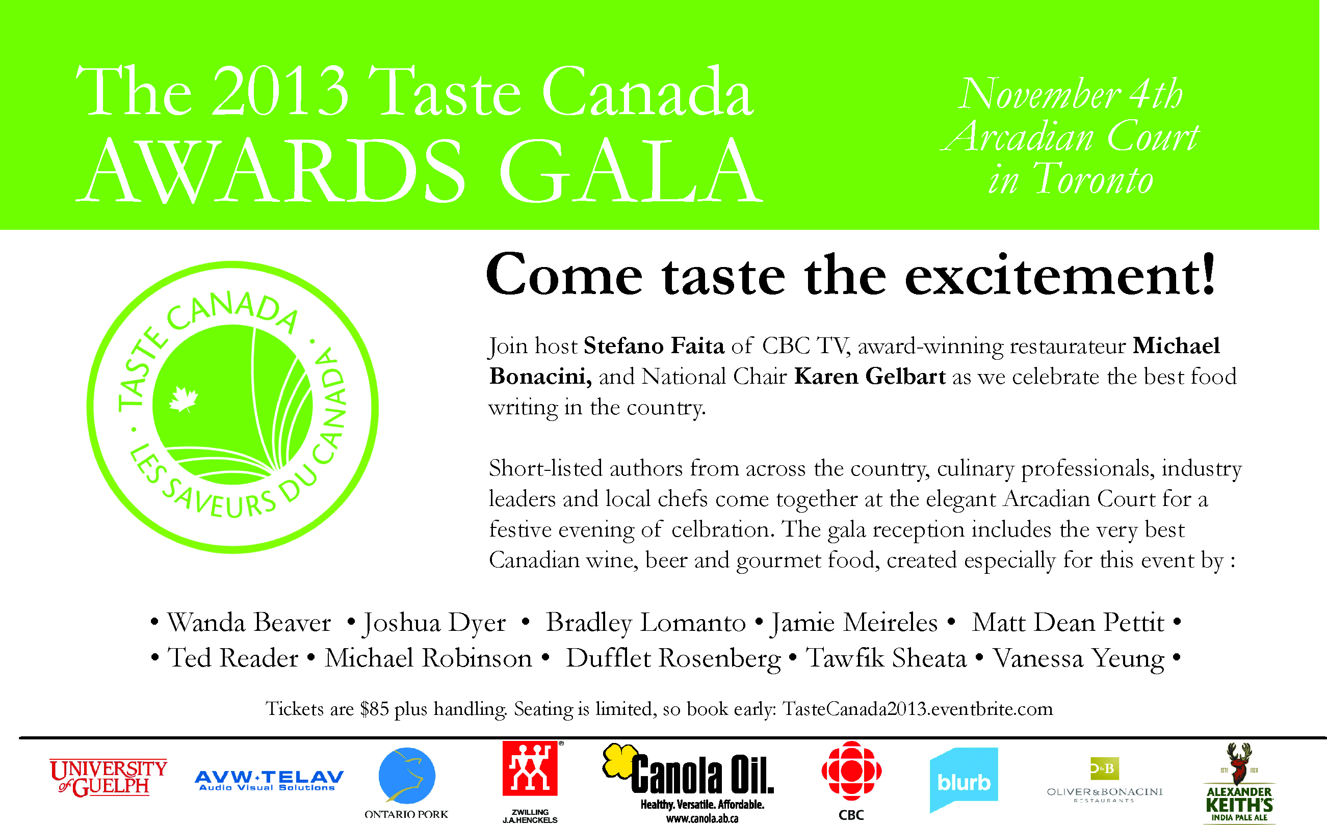 Celebrate Canada's best food writing on November 4th, 2013. The event will kick-off with a welcoming reception, be followed by the awards presentation and topped off with a gala reception with 10 amazing chefs hosting it, and a wine and beer open bar. It's a tremendous networking opportunities and a chance to meet all the book authors and industry leaders