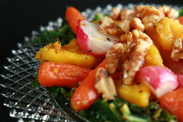 There are simple, yet elegant dishes like a roasted radish salad that can be enjoyed in pyjamas or formal wear.