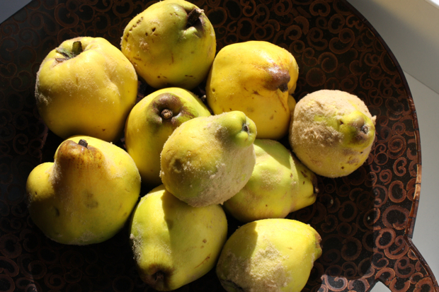 I had heard about quinces for a year or so, and I was so beguiled that I actually asked my green-grocer to call me as soon as the quinces came in. They forgot – which disappoints me to this day – but I did see them at the market anyway and bought as many as I could carry. As I set about poaching the hard woody fruit with a bit of vanilla and sugar, I was smitten. I soon had soft, pinky fruit that smelled of the sweetest medieval perfume. To this day, quinces are still my favourite fall fruit and I scour farmers’ markets for them. I believe – I hope – this post conveys just how wonderful quinces are and encourages readers to try them.