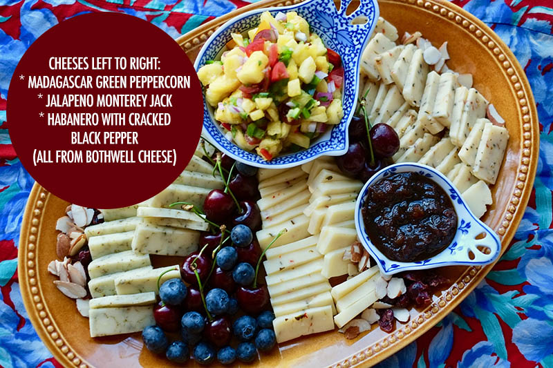 Pairing Ideas: Temper spicy cheeses like Bothwell's Habanero with Cracked Black Pepper or Bothwell's Jalapeño Monterey Jack or Red Hot Chili Pepper Jack with sweet accompaniments such as pineapple or mango salsa, caramelized onion chutney, slivered or whole almonds, and a big bowl of seasonal cherries!