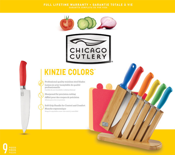 Three (3) Kinzie 9 piece sets. The set retails for $59.99 and includes a 7-3/4" Chef Knife, 7-3/4" Bread Knife, 4-3/4" Utility Knife, Sharpening Steel, 2 each: 3-1/4" Parers, Poly Cutting Boards and 1 Bamboo Storage Block. A great set of knives with lots of colour. Functional and perfect for photo purposes, a food bloggers dream scenario.