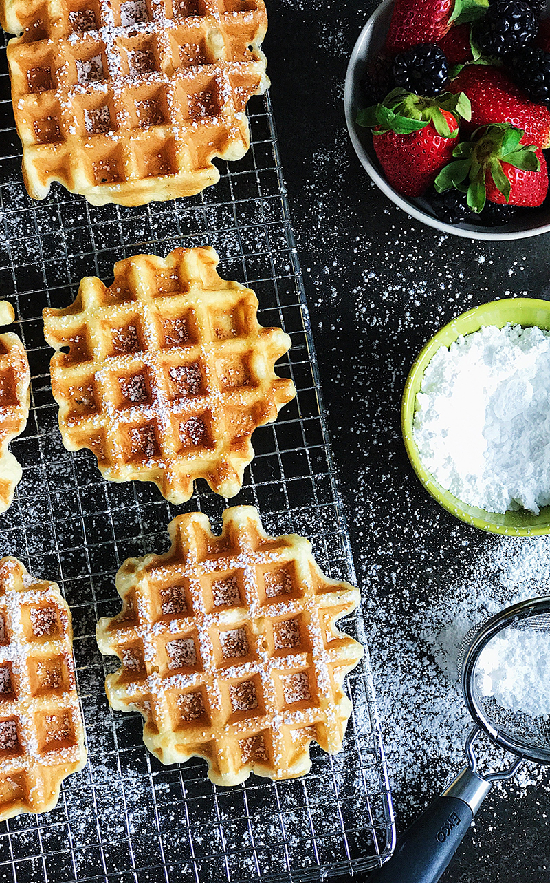 A dusting of sugar "pops" on the waffles. Because the waffles are cold the sugar doesn’t melt into them like it would if they were warm. This is a more “messy” look as I wanted the sugar to fall where it naturally would.