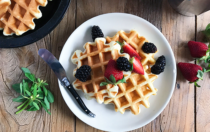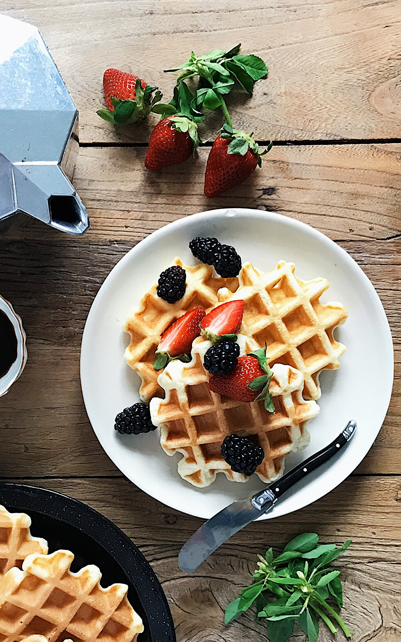 The texture and thickness of a waffle suit an overhead set-up. Each square crevice is the perfect resting spot for a random blueberry or a drop of syrup to run through. A 15- or 45-degree angle also works, but I find unless you are layering significant portions of whipped cream or yogurt between the waffles, the straight on (0-degree) angle doesn’t do the waffle justice. Show off those abs!