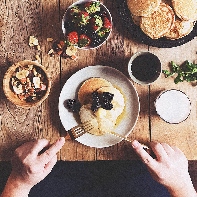 I like to create movement in my photographs and pancakes don’t have a lot of movement (unlike soups and sauces). By just pooling the syrup around the pancakes and adding in two arms you get a much more emotional scene. I was able to use the same props I did for the waffles, but this time added milk and granola.