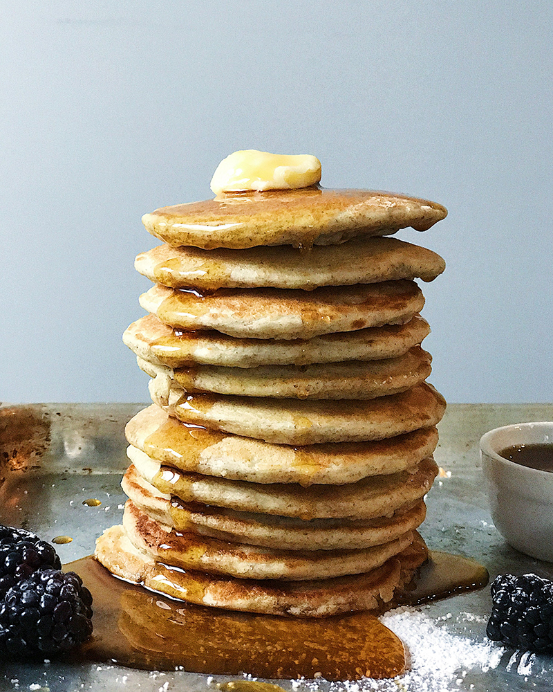 Unlike waffles, pancakes are more difficult to style from a bird's-eye perspective. Flapjacks tend to be thin, flat and brown, and lack much movement. What they do have going for them is height. Everyone can find appeal in a tall stack of pancakes.