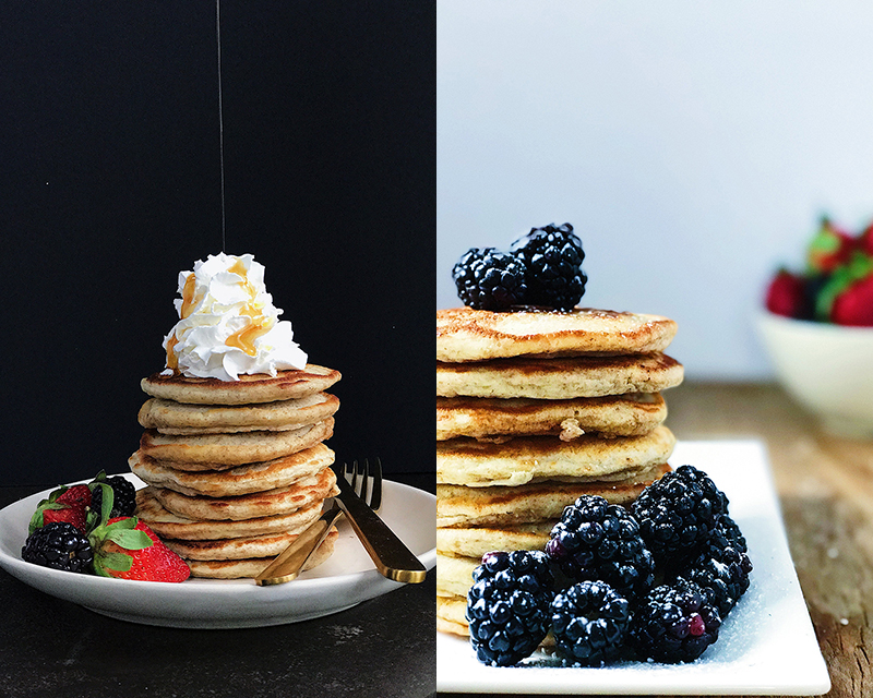 I tend to prefer a wider angle set-up but pancakes can be great to get in close. I think the appeal of the pancake is the stack, so getting in close to show all those brown edges can be very beneficial in the shot.
