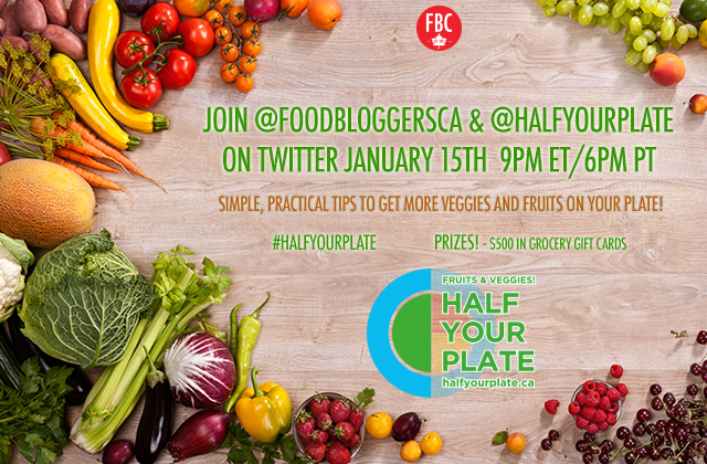 To be eligible to win a gift card prize, you must RSVP (below) and tweet at least once during the party with the #HalfYourPlate hashtag. The winners will be announced throughout the party and be asked to contact Food Bloggers of Canada by Direct Message on Twitter.