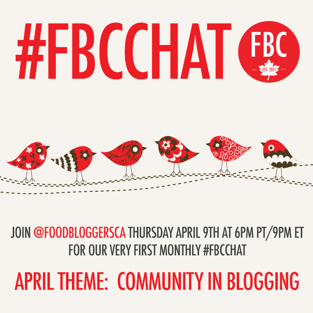 Can't way tot see everyone at 9pm ET/6pm PT on Thursday, April 9th on Twitter for our very first monthly #FBCchat! As always, you can find us on Twitter @FoodBloggersCA!