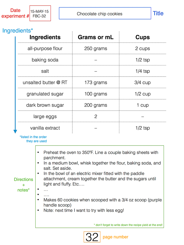 Finish the page with a yield: how many cookies did your recipe make? what size were they? was your recipe a flop? If so, write down why. Even a failed kitchen experiment is useful and there’s always something to learn. Write it down so you don’t forget!