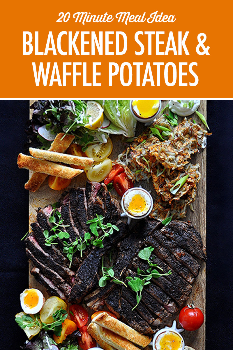 Blackened Steak with Waffle Potatoes and runny eggs elevates breakfast to dinner and it's fast and easy. It's one of our 20 minute meal ideas, made from scratch, that you can serve family style!