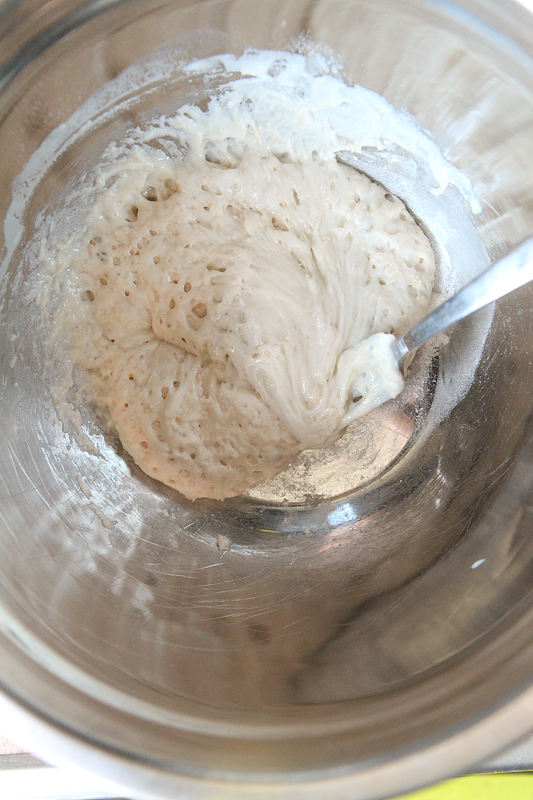 1. Combine the first 3 dough ingredients in a bowl and let sit for 1 hour. This is your starter and it should look like this after an hour.