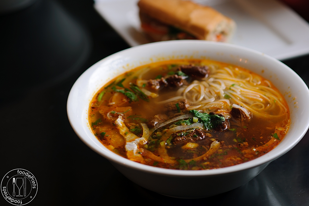 When it comes to soups and sandwiches, the archetypal pairing is comfort food for many North Americans: grilled cheese and tomato soup. Recently, the flavours were even combined as a potato chip flavour. Noodles are comfort to orientals, so we visited a local Vietnamese noodle house for soup and sandwich submission: a bowl of beef stew rice noodlesoup (bo kho) and banh mi sandwich.