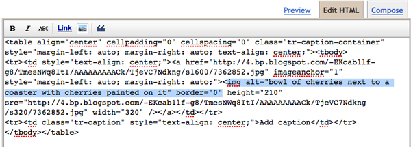 a bowl of cherries next to a coaster with painted cherries on it.Do you upload your photos to your blog with titles like "IMG367-8"?  Stop!  Name your photo before uploading it with a short name that describes the image.  "Cherries" is much more search engine friendly than the name your camera assigns.