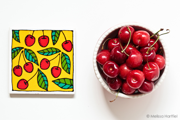 alt="bowl of cherries next to a coaster with cherries painted on it"