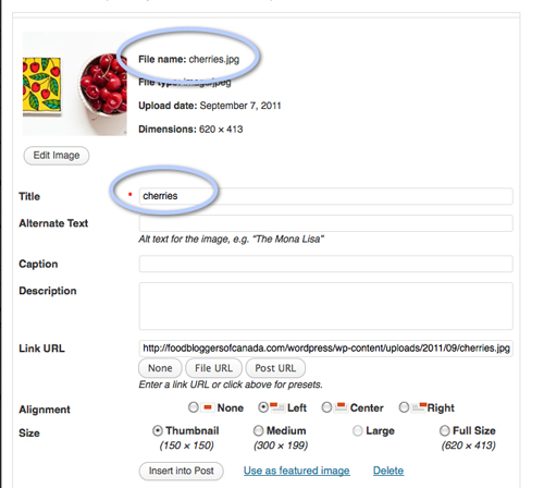 As you can see here in WordPress, I have uploaded the file with the name cherries.jpg.  This is important for those of you using Blogger because Blogger doesn't give you a chance to change the title once it's uploaded so it's best to do it beforehand.  WordPress also gives you a title field that you can change - it will automatically default to the uploaded file's name.  If you renamed it before uploading, you won't need to change it here.