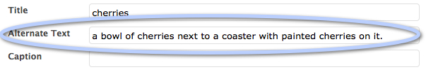 wordpress screenshot showing the Alternate Text Field The Alternate Text field is used by people who use assistive technologies such as screen readers.  This is the description that's read to them when they visit your page.