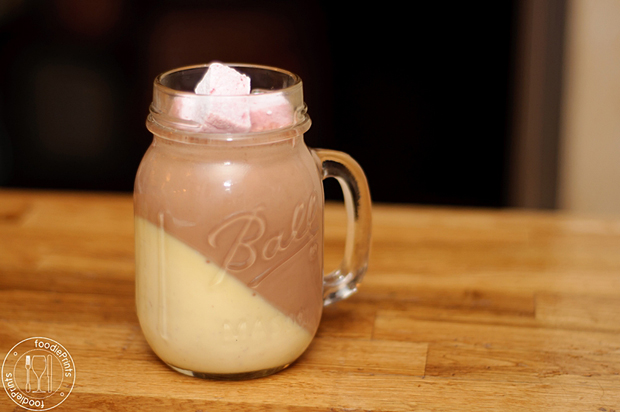 This hot chocolate dessert was conceived of at Brothers Beer Bistro. At the bottom is an eggnog panna cotta. The hot chocolate is spiked with Courvoisier (VSOP Exclusif) cognac. The marshmallows are made with Bellevue Kriek, a Belgian cherry beer.