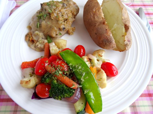 Pork Chops with Bread Stuffing and Creamy Mushroom SauceDessert Suggestion: Rhubarb Pie