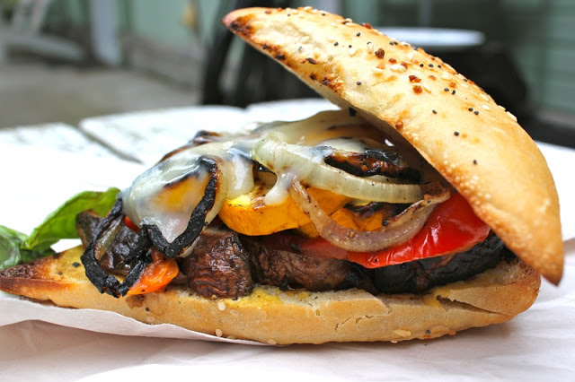 After Saturday's binge, I like something lighter and simpler for Sundays. These grilled veggie "sammiches" are quick, delicious and make good use of the Summer produce on the grill!