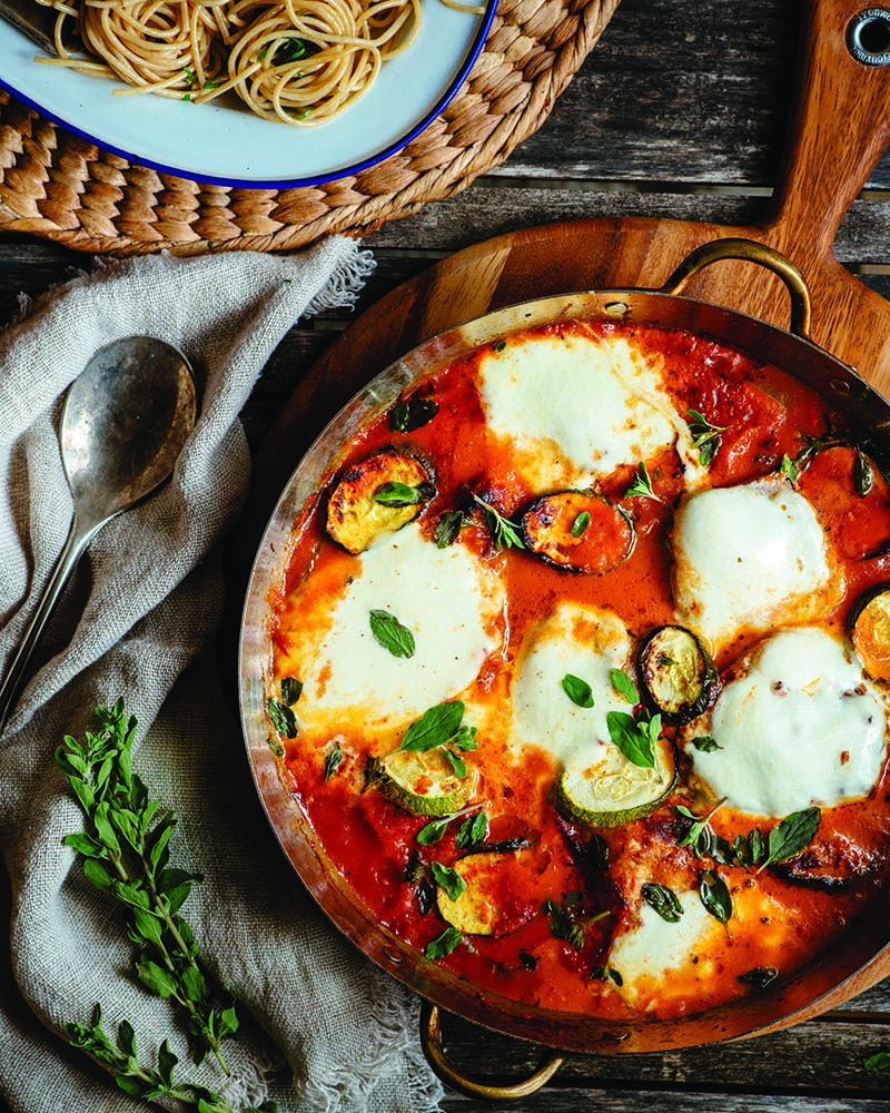 - Add the zucchini to the pan, tucking the pieces around the chicken. Partially cover and simmer for 15 minutes more. Top each piece of chicken with a slice of fresh mozzarella. Replace the lid and finish cooking the dish for about 10 minutes, until the mozzarella melts. Cool slightly while you prepare the pasta.