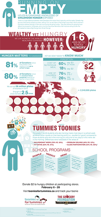 The Grocery Foundation is an Ontario-based not-for-profit, representing leaders from Canada’s grocery industry. It was established in 1979 to enrich the lives and well-being of children; providing them a hand up so they can learn and succeed. To date the Grocery Foundation has raised in excess of $75 million which has gone towards over 250 organizations across the province meeting a number of health and wellness needs including providing nutritious breakfasts and snacks for school-aged students across the province. Many Grocery Foundation companies and their employees also work as volunteers alongside countless community groups nourishing dreams, abilities and brighter futures. 2014 marks the 35th Anniversary of the Grocery Foundation. Follow them on Twitter @GroceryFndtn and @Toonies4Tummies.