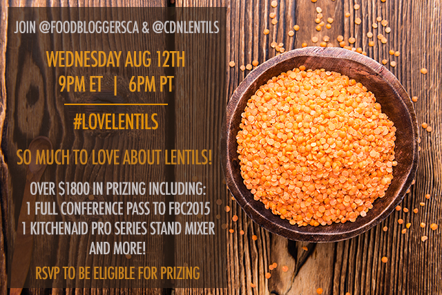 To be eligible to win a prize pack, you must RSVP (below) and tweet at least once (Original tweet, retweets do not count) during the party with the #LoveLentils hashtag. The winners will be announced throughout the party and be asked to contact Food Bloggers of Canada by Direct Message on Twitter. The rules can be found here.
